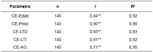 El valor obtenidos de la correlaciones entre CE y alzada al anca (r >0,71), es considerado alto y positivo, el modelo de regresión que más se ajusta a esa relación es el modelo lineal.