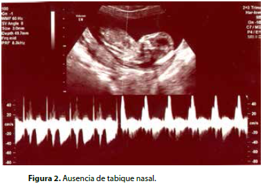 Reporte de ecografía: Embarazo de 15 sem ± 20 días, normohidramnia, higroma quístico, Ausencia de hueso nasal además de una comunicación interventricular. (Figura 1, Figura 2).