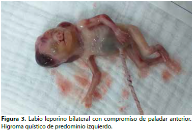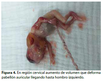 Paciente en sala de legrado bajo sedación profunda, se obtiene producto de sexo masculino con alteraciones faciales y aumento de volumen en región cervical (Figura 3 y 4). queda pendiente el reporte de patología.
