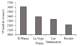 La abundancia total de insectos encontrados fue de 13,393. Resultando la finca El Nance con el mayor número de insectos con un total de 3 617, finca La Vega 3 394, finca Los Guanacaste con 3 341 y la finca Rosales fue la que presentó el menor número con 3 224 (Figura 1). La finca El Nance fue donde se presentó la mayor cantidad de insectos, seguido por finca La Vega, esto se relaciona a la abundancia de vegetación (malezas de hoja ancha) que predominó durante el periodo de evalua