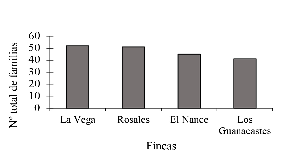 En la finca La Vega se encontró el mayor número de familias de insectos con un total de 52 y 51 para Rosales, en El Nance y Los Guanacaste se encontró un menor número con un total de 45 y 41 respectivamente (Figura 2). La finca La Vega se caracterizó por presentar mayor cobertura vegetal (malezas de hoja ancha) durante el periodo de evaluación y se asume este factor como la posible causa de una mayor presencia de insectos respecto a las demás fincas.
