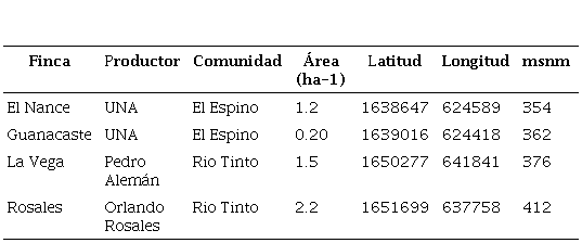 El estudio se realizó de julio de 2016 a marzo del 2017 en cuatro fincas de cacao en producción. Las fincas se ubican en el municipio de Catacamas del departamento de Olancho,Honduras; dos de ellas se ubican en el campus de la Universidad Nacional de Agricultura y las otras en la aldea de Río Tinto a 20 km al sureste de la ciudad de Catacamas. La temperatura media es de 26.6ºC con precipitación promedio anual de 1 500 mm anuales.