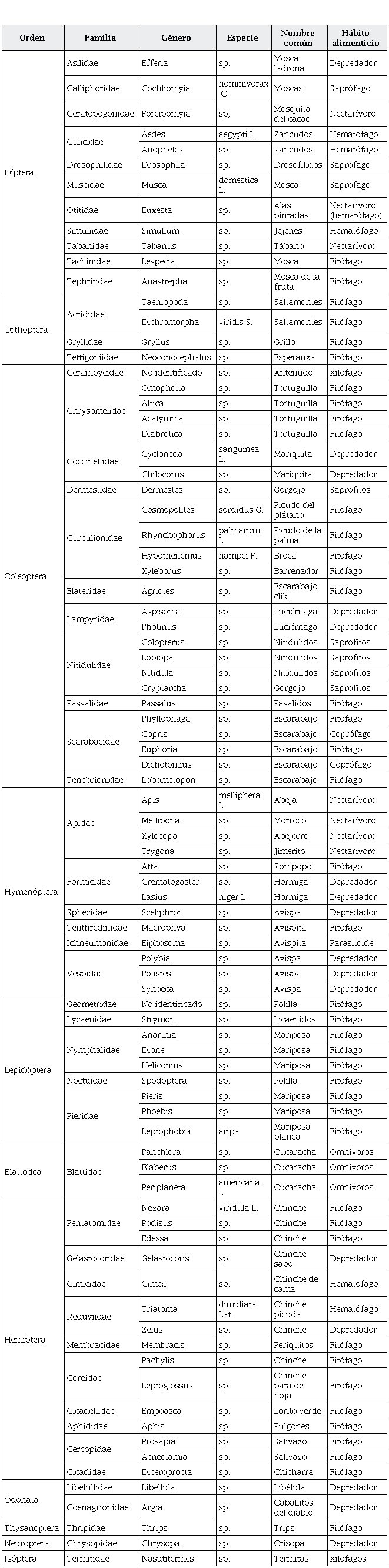 Se encontró un total de 11 órdenes de insectos, 52 familias y 87 géneros en las cuatro fincas estudiadas, las familias más dominantes fueron Formicidae, Muscidae, Scarabaeidae, Ceratopogonidae y Apidae.