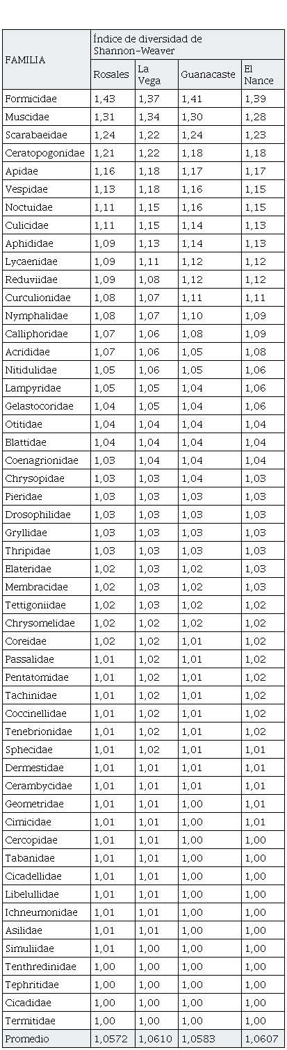 Los promedios de diversidad según Shannon en este estudio resultan ser bajos, con valores de 1,05 para Rosales y Los Guanacaste y 1,06 para La Vega y El Nance, considerados como un ecosistema de baja biodiversidad, ya que Shannon-Weaver (1949) considera que valores inferiores a 2 representa zonas de baja biodiversidad y superiores a 3 zonas de alta biodiversidad.