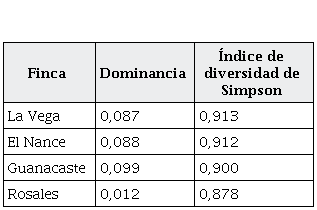 Se presentó mayor dominancia de especies por familias de insectos en la finca Rosales (0,012) (Cuadro 4). Por su parte el menor índice de diversidad de Simpson lo tiene la finca Rosales y los mayores valores de diversidad lo presentan las fincas La Vega, El Nance y Guanacaste. Este índice de diversidad (1-D), es inversamente proporcional a la Dominancia (D), por lo que las fincas La Vega, El Nance y Guanacaste son menos diversas en número de especies por familias, pero más dominantes.