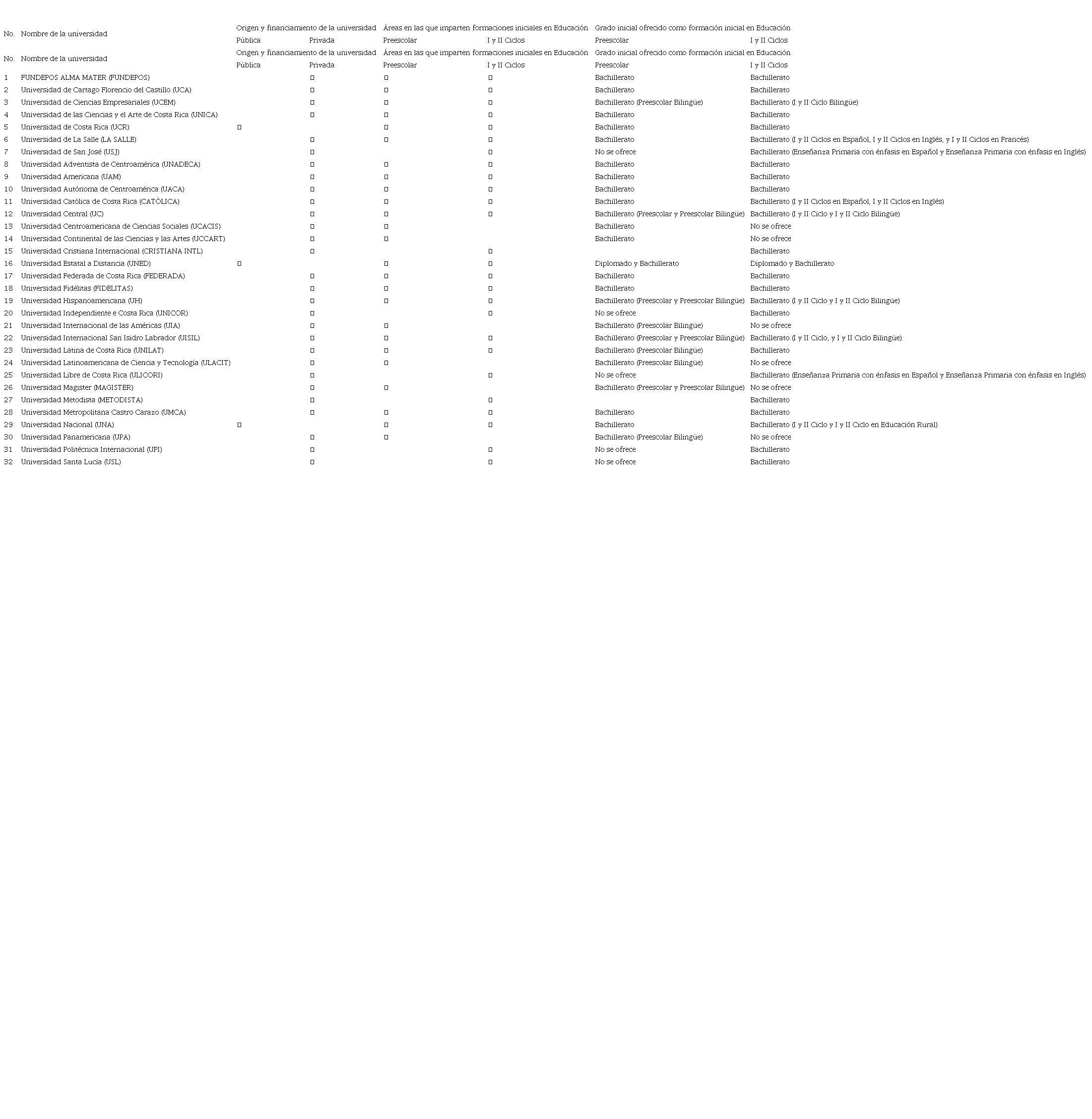 El mapeo realizado de programas universitarios arroja que en Costa Rica existen 26 programas universitarios autorizados como titulaciones de nivel inicial en Educación para I y II Ciclos (3 universidades públicas y 23 universidades privadas), pero en la actualidad sólo se ofrecen 19 programas (3 universidades estatales y 16 universidades privadas) pues ocho universidades privadas han optado por solo mantener abierta la matrícula en los programas con concentración en inglés, hecho que plantea potencialmente otro reto país en materia de lectoescritura en L1 (español) pues implica que un porcentaje importante de docentes de primaria que hoy se forman en universidades privadas reciben la formación en didáctica de la lengua para una L2 (inglés) y no para su L1 (español).