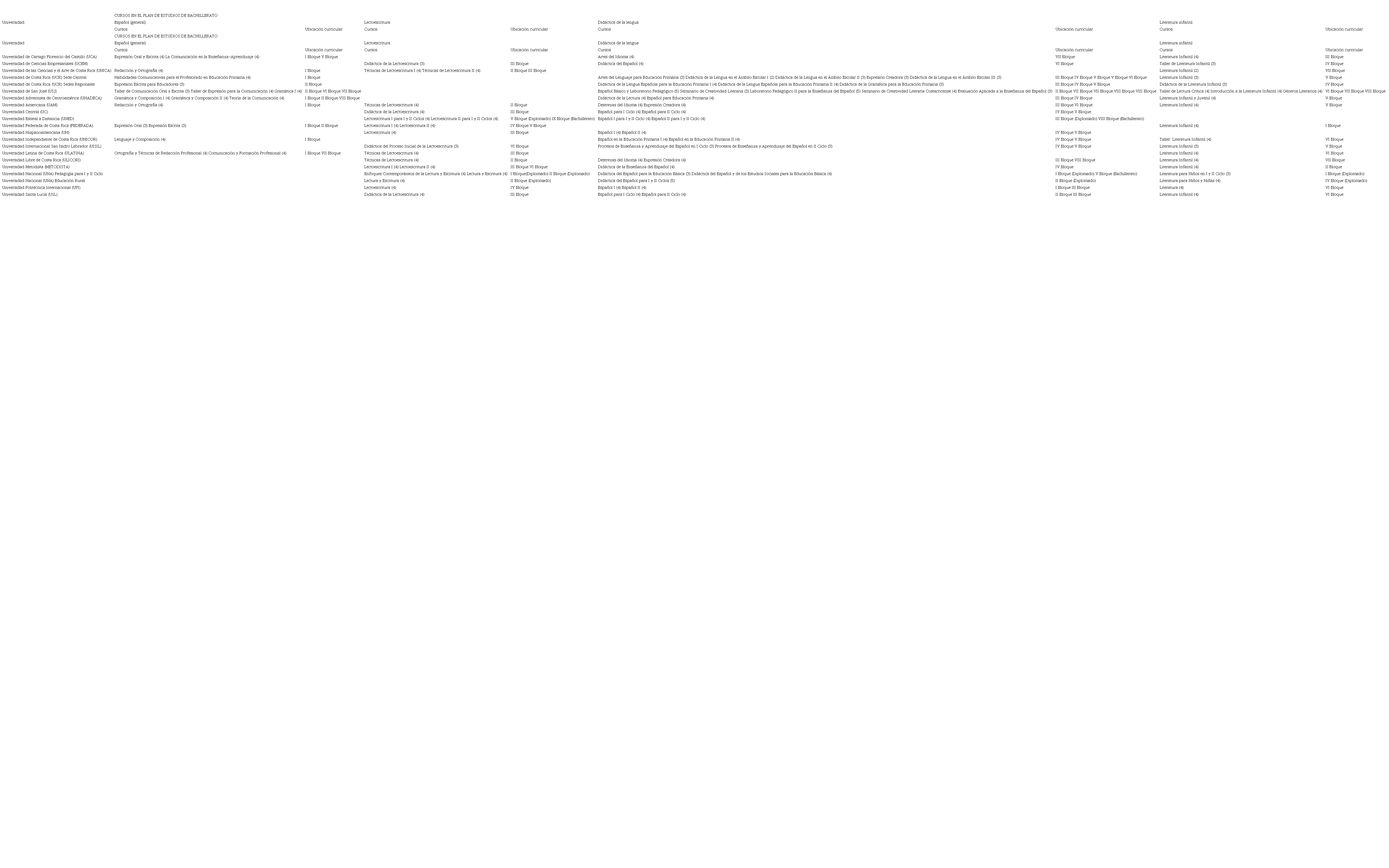 Luego de hacer la comparación anterior, se procedió a analizar en detalle la formación que cada uno de estos 19 programas de estudio ofrece en lectoescritura y/o en lengua española general o didáctica de la lengua.