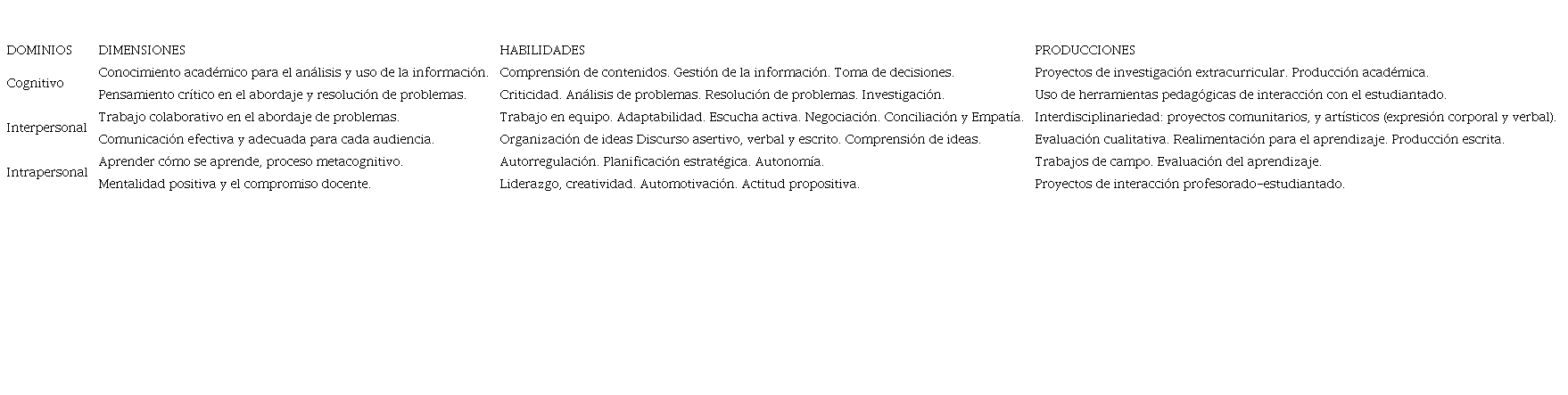 Se entiende por habilidades las funciones que desempeña un individuo de manera relativamente fácil o práctica, en este caso, se refiere a la destreza con que se ejecutan las acciones del quehacer docente. Algunas habilidades se poseen desde edades tempranas y otras se van desarrollando o potenciando conforme se utilizan en el diario vivir. El estudiantado considera que el proceso de AP desarrolla habilidades para aprender a enseñar de manera significativa; las habilidades se categorizan a continuación según su dominio cognitivo, interpersonal e intrapersonal.