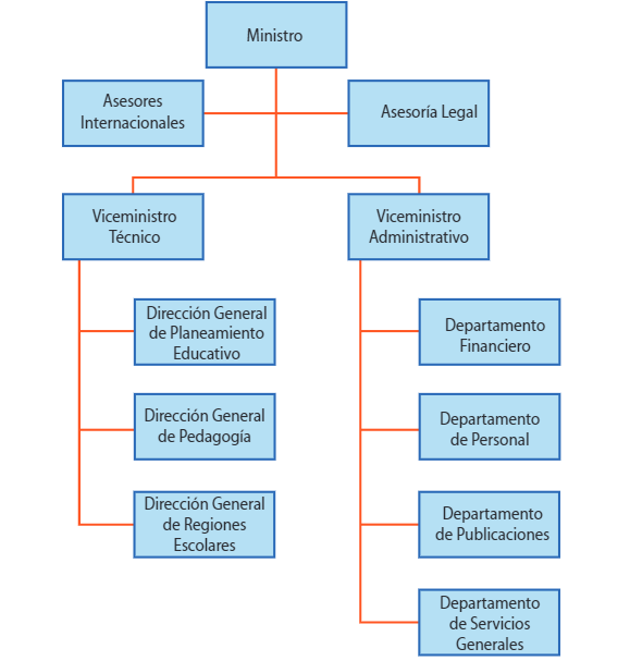 1. Órganos de decisión: el ministro y dos viceministros uno por cada sector, un viceministro del sector técnico-pedagógico y un viceministro de lo propiamente administrativo. De acuerdo con don Uladislao se llegó a esta agrupación por sectores al cabo de un profundo estudio de reforma administrativa en 1972, que consideró las variadas funciones del ministro y la necesidad de delegar funciones político-administrativas.