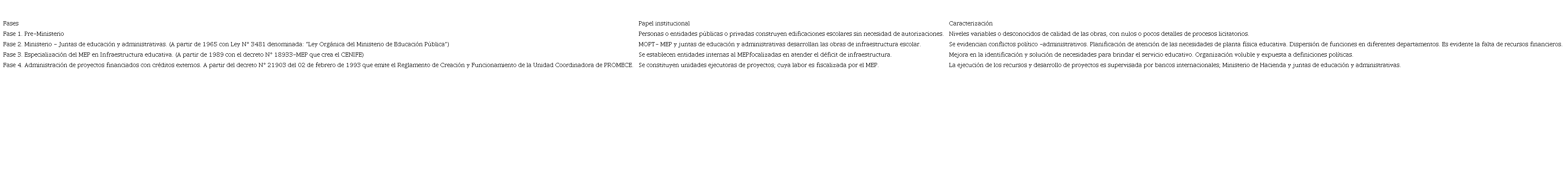 La tabla 1 presenta las fases en que se puede aglutinar la evolución de la organización ministerial para enfrentar el problema