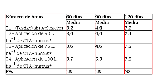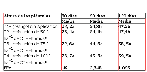 En la respuesta altura de las plantas (Tabla 1), se encontró diferencias significativas entre tratamientos, los tratamientos estimulados son superiores a los 120 días con relación al testigo, observando que el tratamiento (4) que se corresponde con la aplicación de 100 L. ha-1 de CTA- Humus® ofreció una mejor respuesta para esta variable de crecimiento, en los diferentes momentos de medición.
