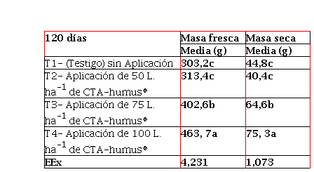 En la respuesta altura de las plantas (Tabla 3), se encontró diferencias significativas entre tratamientos, los tratamientos estimulados son superiores a los 120 días con relación al testigo, observando que el tratamiento (4) que se corresponde con la aplicación de 100 L. ha-1 de CTA- Humus® ofreció una mejor respuesta para esta variable de crecimiento, en los diferentes momentos de medición.
