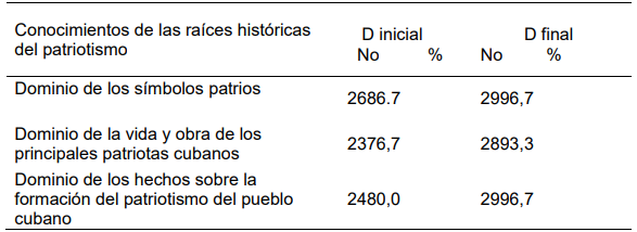 En la tabla # 1 que representa la dimensión. Conocimientos de las raíces históricas del patriotismo,en la escala que representael indicadordominio de los símbolos patrios crece a un 96,7 %, los estudiantes que al final conocen que representa cada elemento en la bandera y el escudo así que representan para los cubanos, así como fue su origeny en cuanto a la himno conocen que representa para los cubanos como una marcha de combate el cual muestra el sacrificio que debemos tener por el amor a la patria;aunque inicialmente tenían algún desconocimiento sobre que representa cada elemento en la bandera y el escudo en la escala de que representa el indicador el dominio de la vida y obra de los principales patriotas cubanoscrece a un 93,3 %, aquellos queal final conocen la vida y obra de los principales patriotas cubanos, aunque inicialmente existía desconocimiento de alguno de los patriotas principalmente de la localidad y la escala que representael indicador de dominio de los hechos sobre la formación del patriotismo del pueblo cubano crece a un 96,7% que al final logran conocer cómo surgió la nacionalidad cubana con los principales hechos así como los principales hechos patrióticos en las diferentes épocas, aunque inicialmente desconocen algunos hechos que se produjeron en la localidad.
