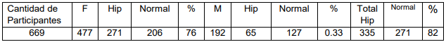 Al realizar un estudio minucioso del comportamiento de los resultados comprobados en las encuestas a los 35 profesores de cultura física sobre el indicador a medir, relacionado con la correspondencia entre las metodologías utilizadas en sus alternativas o ambas detalladas en la presencia de personal capacitado y equipos para medir la presión arterial antes de comenzar su clase, para dicha interrogante se desarrolló un desglose de personas hipertensas detalladas por su sexo, quedando la misma de la siguiente forma: cantidad de personas hipertensas 669 de ellas 477 son del sexo
