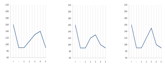 En la tercera toma del pulso se comportó a 104,6 pulsaciones por minuto, en la segunda y tercera prueba se comporto a 105,3 pulsaciones por minuto en la cuarta toma del pulso en la primera prueba se comportó 105,33 pulsaciones por minuto, en la segunda prueba 99,33 pulsaciones por minuto y en la tercera prueba 98,6 pulsaciones por minuto, en la quinta y ultima toma del pulso en la primera prueba se comportó a 84,6 pulsaciones por minuto en la segunda prueba se comportó a 80,0 pulsaciones por minuto y en la tercera se comportó a 71,3 pulsaciones por minuto, es de destacar en esta valoración que ha existido una disminución gradual de la presión arterial y la frecuencia cardiaca existiendo una aceptable recuperación de los pacientes al detectar los resultados estadísticos de los signos vitales de la relación entre presión arterial y frecuencia cardiaca (ver anexo II)