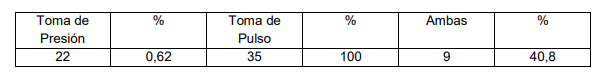 En el caso de los masculinos 127 son normales y 65 hipertensos lo que representa el 33 punto porcentual de los practicantes al computar todos los resultados existen un total de 335 practicantes hipertensos y 271 normales lo que representa el 82 punto porcentual del total de los practicantes de estos resultados se detectaron que de los 35 técnicos encuestados 22 tienen en sus círculos de abuelo personal y equipos capacitados para la medición de la presión arterial y 13 que no tienen personal ni equipos para la medición de la misma comportándose a un 62 punto porcentual de esta técnica empleada de la toma del pulso 35 para un 100 punto porcentual y que utilizan ambas técnicas para un 40,8 punto porcentual por lo que queda demostrado la correcta utilización de los medios para dicho control (ver tabla I).
