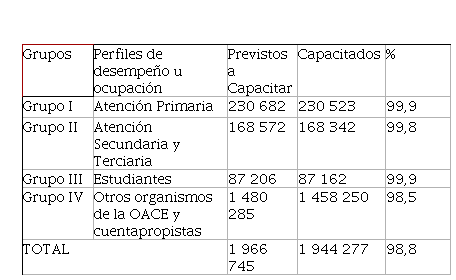 Del personal posible a capacitar, fueron capacitados un total 1 944 277 personas, de ellas: profesionales y trabajadores en la Atención Primaria de Salud 230 523 (99,9 %); en la Atención Secundaria y Terciaria de Salud 168 342 (99,8 %) y estudiantes 87 162 (99,9 %) (Tabla).