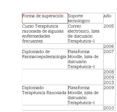 El primer intento de modalidad virtual para la superación de la red de Farmacoepidemiología fue el curso “Terapéutica razonada de algunas enfermedades frecuentes”, que centra la capacitación en el método de la prescripción razonada, propuesto por la Organización Mundial de la Salud para lograr el uso racional de los medicamentos.