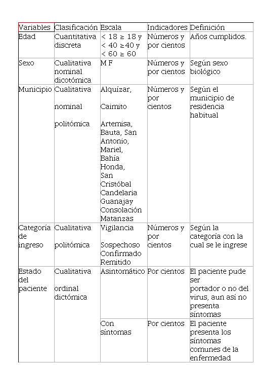El objetivo de este artículo fue caracterizar desde el punto de vista clínico- epidemiológico a los pacientes ingresados en la sala de aislamiento de San Cristóbal, provincia de Artemisa en el periodo de Marzo-Mayo de 2020.