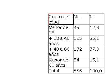 Prevaleció el grupo de 40 a 60 años con el 37 %, seguido del grupo de 18 a 40 años con el 35,1 %de los ingresados, siendo el 12,6 % menor de 18 años y el 15,1