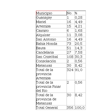 De los 356 casos el 91 % era residente de la provincia Artemisa, el 8,42 % de la provincia Matanzas y el 0,56 % se le atribuían a Pinar del Río. Dentro de la provincia Artemisa el municipio de mayor incidencia en ingreso fue San Cristóbal (30,3 %), seguido del municipio Bahía Honda con el 20,5 % del total de la muestra (Tabla 3).