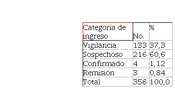 De los ingresados 4 fueron confirmados representando el 1,12 % de la muestra, todos presentaron evolución clínica estable, hubo tres remisiones y 216 sospechosos para el 60,6 % de la muestra (Tabla 4).