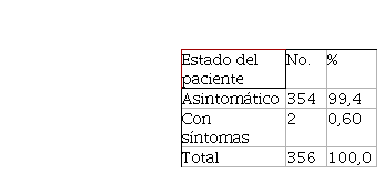 La mayoría de los pacientes ingresados se encontraban asintomáticos, 2 presentaron síntomas los cuales fueron positivos al Reacción en Cadena de la Polimerasa (PCR) en tiempo real (Tabla 5).