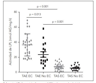 Los pacientes con EC presentaron mayor actividad de LPL en TAE respecto de los pacientes sin EC; a su vez, la actividad de LPL de TAE fue mayor que la de TAS en ambos grupos (Figura 1), aun luego de corregir por el consumo de aspirina (F = 5.85; p = 0.006) y por el grado de RI (F = 3.55; p = 0.039).