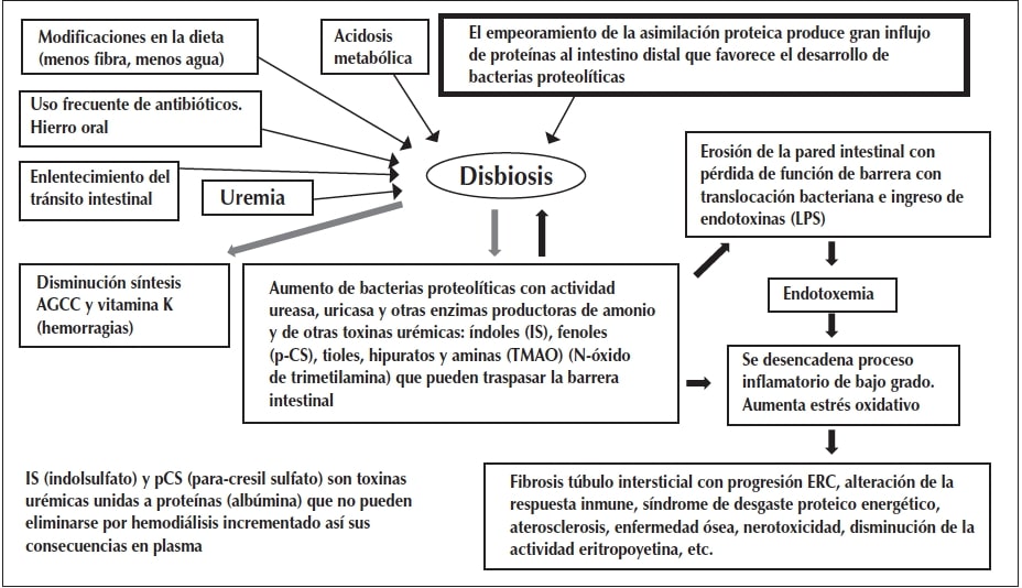 La pérdida de la función renal produce un mayor ingreso de urea dentro del tracto gastrointestinal lo cual, junto con el empeoramiento de la asimilación proteica de la dieta, produce gran influjo de proteínas al intestino distal y favorece el desarrollo de bacterias proteolíticas. A través de la ureasa expresada por algunas bacterias intestinales (especialmente Clostridium spp, Enterococcus, Shigella, Escherichia coli), se generan altos niveles de amonio y otros tóxicos que afectan el crecimiento de las bacterias comensales y alteran la permeabilidad de la barrera intestinal, permitiendo la translocación bacteriana y el ingreso de endotoxinas (LPS), desencadenando un estado inflamatorio de bajo grado que colabora con la progresión de la ERC, la enfermedad cardiovascular, la resistencia insulínica, la pérdida de la energía proteica y la alteración del sistema inmune, etc.22-25.