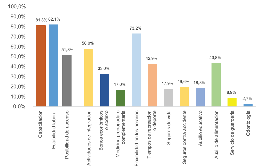 Retribuir con beneficios no monetarios a los colaboradores, con el fin de tener cada vez más talento satisfecho, altamente productivo y con un alto sentido de compromiso con la organización, es una de las nuevas tendencias que se toma a las organizaciones, y es conocida como el salario emocional (Gómez, 2011), concepto que como se evidencia en la figura 3 la mitad de los hoteles (50%) no lo conoce, el 32,1% lo conoce y lo aplica, mientras que solo el 17,9% conoce el concepto pero no lo aplica, lo cual evidencia que falta capacitación a este sector para fortalecer el bienestar de sus colaboradores. Además, según la Asociación Española (2017) para la Calidad, el salario emocional es un concepto asociado a la retribución de un empleado en la que se incluyen cuestiones de carácter no económico, cuyo fin es satisfacer las necesidades personales, familiares y profesionales del trabajador, mejorando la calidad de vida del mismo, fomentando la conciliación laboral.