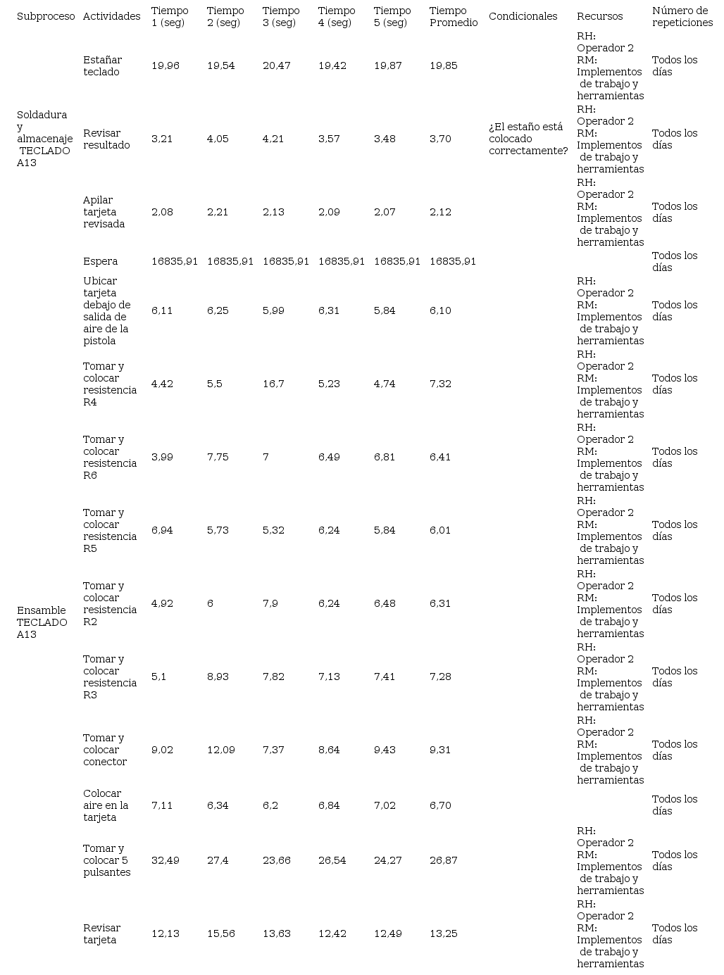A manera de ejemplo, tanto en la Tabla 3, como en el Gráfico 1, se puede visualizar el proceso de ensamblaje correspondiente a teclados (tarjetas electrónicas).