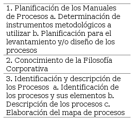 Para la obtención de información necesaria se propone una combinación de los dos modelos de gestión mencionados anteriormente, siendo necesario estructurar una metodología de levantamiento de procesos. Para plantear la misma, se estudió literatura científica referente al tema, considerando: la Guía de levantamiento de procesos (Ortega Vindas, 2009), el Manual de gestión de procesos (Servicio de Evaluación, Planificación y Calidad, 2011), la Guía para una gestión basada en procesos (Beltrán Sanz et al., 2009) y la Guía para el levantamiento de procesos institucionales y diseño de indicadores (Área de Planificación y Evaluación MOPT Seguridad Vial, 2015). Las cuatro guías mencionadas tienen como sustento para su elaboración la Norma ISO 9000 (International Organization for Standardization, 2000a), el Servicio de Calidad de la Atención Sanitaria (Servicio de Salud de Castilla-La Mancha, 2002), el Instituto Centroamericano de Administración Pública - ICAP (2006), el Modelo de Excelencia EFQM (European Foundation for Quality Management, 1988), la Norma ISO 9001 (International Organization for Standardization, 2000b), el Plan Pegasus (Universidad Politécnica de Valencia, 2006), la UNE 93200 (Asociación Española de Normalización, 2008), el Cuadro de Mando Integral (Kaplan & Norton, 1997), Estrategia Competitiva (Porter, 2000), la Norma técnica Inteco (Instituto de Normas Técnicas de Costa Rica, 2004), entre otras. Así, la literatura revisada posee un sustento y base sólida que permite sugerir que la metodología propuesta, con base a aspectos comunes de las previamente analizadas, es adecuada y necesaria para los casos estudiados. La misma está constituida por las siguientes etapas fundamentales: planificación de los manuales de procesos, conocimiento de la filosofía corporativa e identificación y descripción de los procesos (Tabla 1).