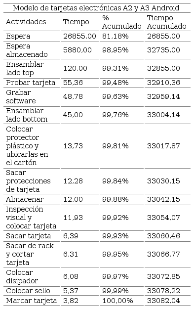Para la construcción del diagrama de Pareto se consideraron el tiempo de ejecución, porcentaje acumulado y tiempo acumulado de las actividades indicadas en la Tabla 4 y Gráfico 6. Se determinó que el mayor tiempo de ocupación son las “esperas” entre ciertas actividades que tienen las tarjetas electrónicas ensambladas, puesto que estas se mantienen almacenadas por un tiempo considerable.