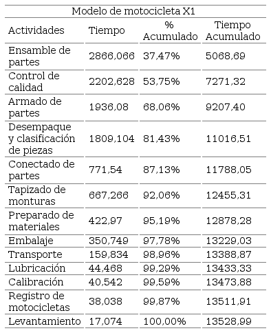 En lo que se refiere a la empresa de producción manual de motocicletas, al realizar un análisis de todos los modelos, se determinó que el X1 es el que ocupa un mayor tiempo de ensamble, esto se debe principalmente a que el modelo tiene más componentes de materia prima y por ende, la colocación y ensamble de las piezas en el chasis toma mayor duración. A continuación en la Tabla 5 y en el Gráfico 7, correspondientes al diagrama de Pareto, se muestra que la actividad crítica es el ensamble de partes.