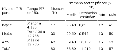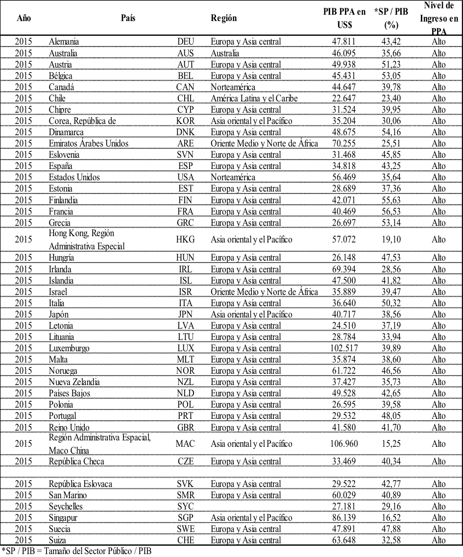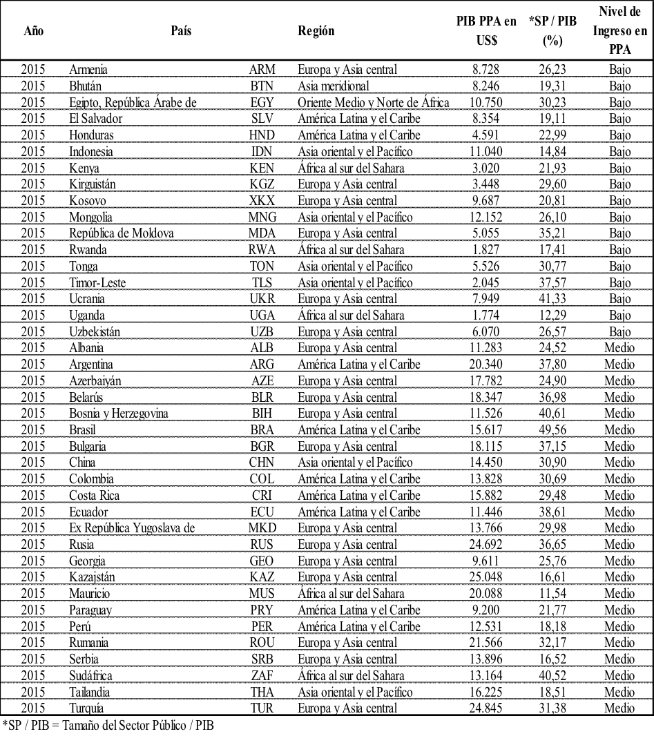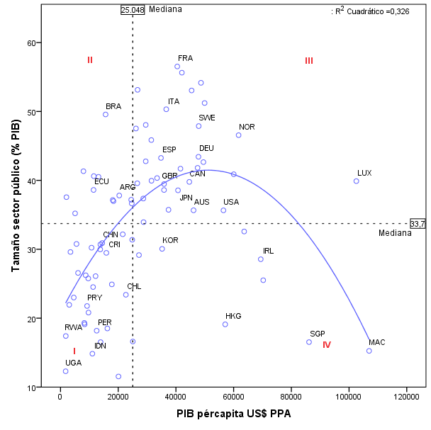 El cuadrante I, agrupa a países con PIB per cápita y tamaño del sector público inferior a la mediana, en donde encontramos países de ingreso medio de la región latinoamericana como Perú (PER), Colombia (COL), Costa Rica (CRI), Chile (CHL) y Paraguay (PRY), así como China (CHN) en Asia, y países de ingreso bajo de África como Ruanda (RWA) y Uganda (UGA). En el segundo cuadrante se agrupan países con un sector público grande superior a 33,7% pero con un desarrollo económico medido por su PIB per cápita similar a los países del cuadrante 1. Para Latinoamérica encontraríamos en esta posición a países como Brasil (BRA), Ecuador (ECU), Argentina (ARG), los cuales, a pesar de destinar una gran proporción de recursos de la economía para financiar las actividades estatales, no han conseguido diferenciarse en cuanto a resultados económicos de los países del cuadrante uno que con un menor tamaño de su sector público logran similares niveles de ingreso per cápita. Si miramos por el tamaño del sector público, estos países del cuadrante II, tienden a parecerse a países desarrollados (cuadrante III) como España (ESP), Reino Unido (GBR), o Alemania (DEU), pero muy por debajo en cuanto a niveles de ingreso per cápita.