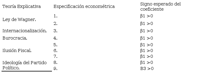 En la tabla 3, se presenta la definición de las variables independientes para cada una de las teorías explicativas y el signo teórico esperado de los coeficientes, que para las relaciones planteadas en este estudio, se espera que sean todos positivos.