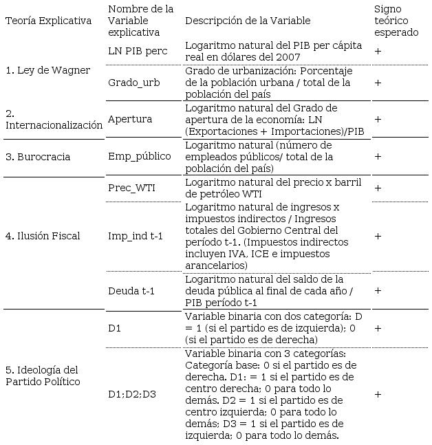 En la tabla 2 se especifican los modelos para probar empíricamente cada teoría. La variable dependiente que mide el tamaño del sector público en Ecuador es la ratio Gasto Público / PIB denominada GOV y en logaritmos LN_GOV. El gasto público abarca las operaciones del sector público no financiero que incluye los gastos corrientes y de capital de las empresas públicas no financieras, de los gobiernos seccionales y del gobierno central. Se excluye el gasto en intereses de la deuda, a fin de reflejar el consumo real en bienes y servicios, personal, inversiones y de capital del sector público dentro de la economía.