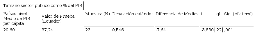 A continuación, a fin de determinar si la evidencia estadística apoya las conclusiones del análisis gráfico, se aplica un test de diferencia de medias (tabla 4) entre el tamaño del sector público de Ecuador y el grupo de países de renta media, medido por su PIB per cápita en PPA.