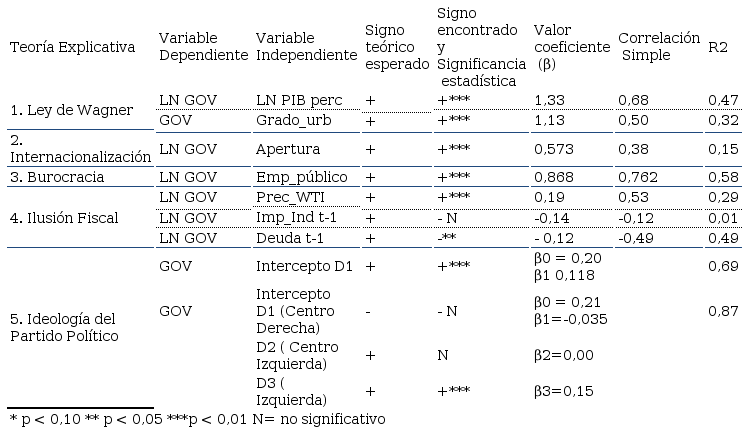 De las cinco teorías explicativas del crecimiento del sector público en Ecuador, únicamente para dos de estas teorías (ideología del partido político y burocracia) se encontró sustento empírico fuerte. A continuación, se analizan los resultados obtenidos: