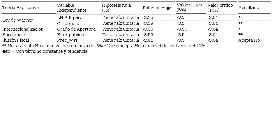 Para estimar los modelos econométricos de los factores asociados al crecimiento del sector público en Ecuador, se aplica el método de Mínimos Cuadrados Ordinarios (MCO) y la prueba de raíz unitaria Dickey y Fuller aumentada para determinar la estacionariedad o no estacionariedad de cada variable. Para las regresiones que resulten significativas bajo MCO, se realiza el análisis de cointegración mediante la aplicación del test de Engle y Granger aumentado (EGA) a fin de comprobar que se trata de relaciones de largo plazo entre las dos variables cointregradas y no de una regresión espuria. Adicionalmente, para probar la hipótesis de Wagner, se aplica el test de causalidad de Granger para determinar la relación de causalidad entre el tamaño del Estado y la variable explicativa PIB pér cápita y la dirección de dicha causalidad, a saber: causalidad unidireccional, bidireccional o relación de independencia. Para el análisis se usa el programa estadístico SPSS e Eviews 10.
