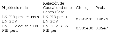 Se halló evidencia parcial a favor de la existencia de una relación de equilibrio a largo plazo entre crecimiento económico y tamaño del sector público, por lo que se exploró la posible relación entre estas dos variables mediante el test de causalidad de Granger. De los resultados obtenidos, se descarta la posibilidad de que sea el gasto público el que determina la actividad económica, es decir la relación de causalidad va del PIB per cápita al gasto público (LN PIB per→ LN GOV) y no al revés para el caso de la Economía de Ecuador. Esta evidencia tiene importantes implicaciones de política económica debido a que contradice la teoría keynesiana ya que, si la causalidad va del ingreso al gasto público, este último no puede ser usado como un instrumento exógeno para incidir en el crecimiento económico y en el ingreso agregado en el largo plazo.