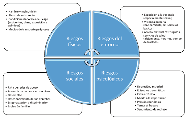 A continuación, presentamos una gráfica sintética de los principales factores de riesgo para la salud y de su interconexión, puesto que se potencializan entre ellos hasta aumentar sensiblemente la vulnerabilidad de quienes cuentan con varios de ellos y provocar situaciones que rebasan la capacidad individual de resiliencia de los migrantes.19