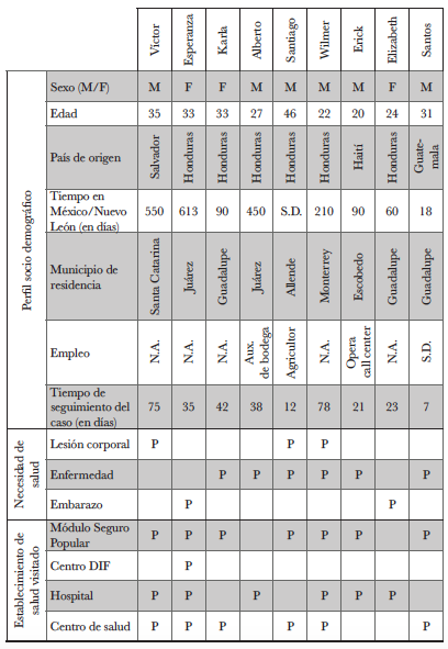 Presentamos aquí los resultados de la primera fase, basados en nueve observaciones directas no participantes realizadas acompañando a personas migrantes irregulares en sus recorridos por el Sistema de Salud entre septiembre de 2017 y julio de 2018 en la zona metropolitana de Monterrey (ZMM). El tiempo promedio de seguimiento fue de 37 días por caso, entre altas en el seguro, consultas en centros de salud, atención en urgencias de hospitales y visitas de seguimiento y control. Observamos sus experiencias en distintos momentos y en cinco centros de salud, dos hospitales, una oficina del Sistema Nacional para el Desarrollo Integral de la Familia (DIF) y cuatro módulos de afiliación al Sistema de Protección Social en Salud (cuyo brazo operativo es comúnmente conocido como Seguro Popular).