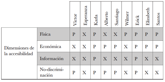 A continuación, presentamos una síntesis de las experiencias de los nueve individuos observados respecto a las cuatro dimensiones del principio de accesibilidad: