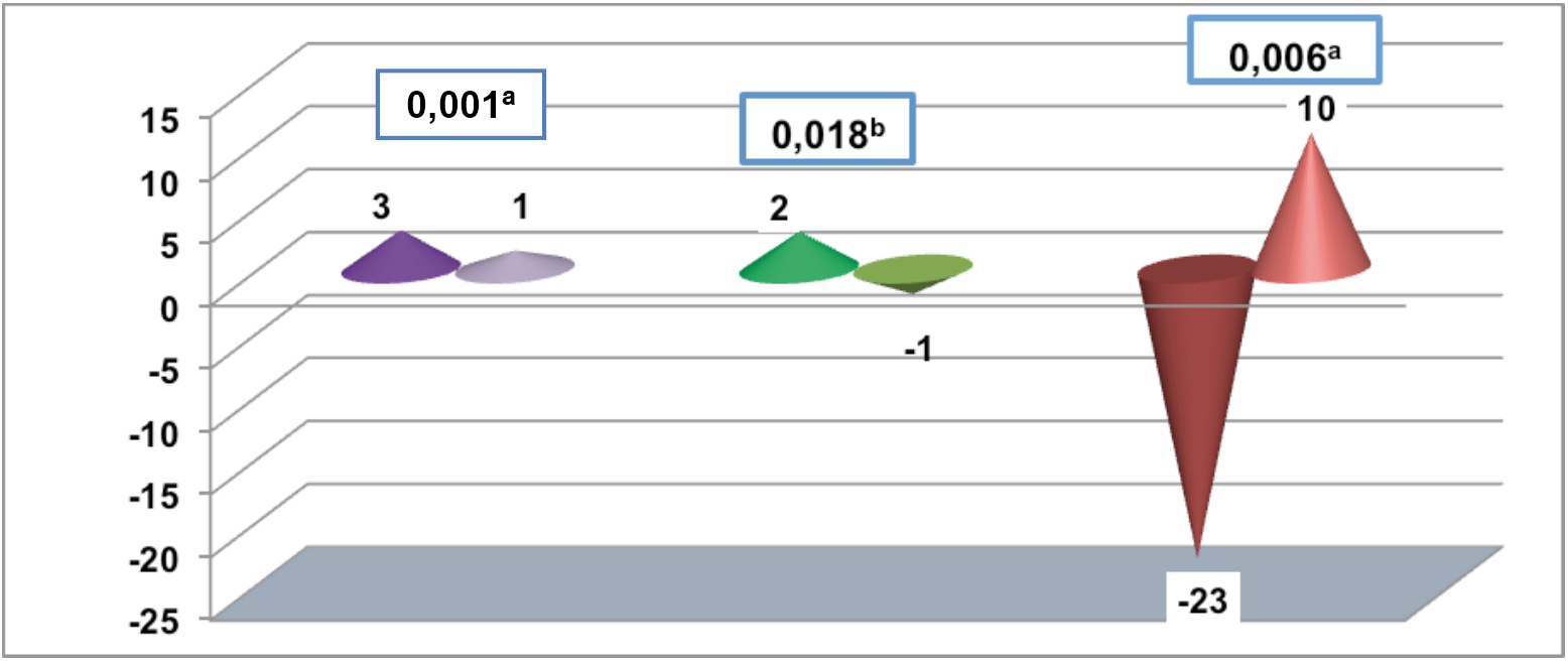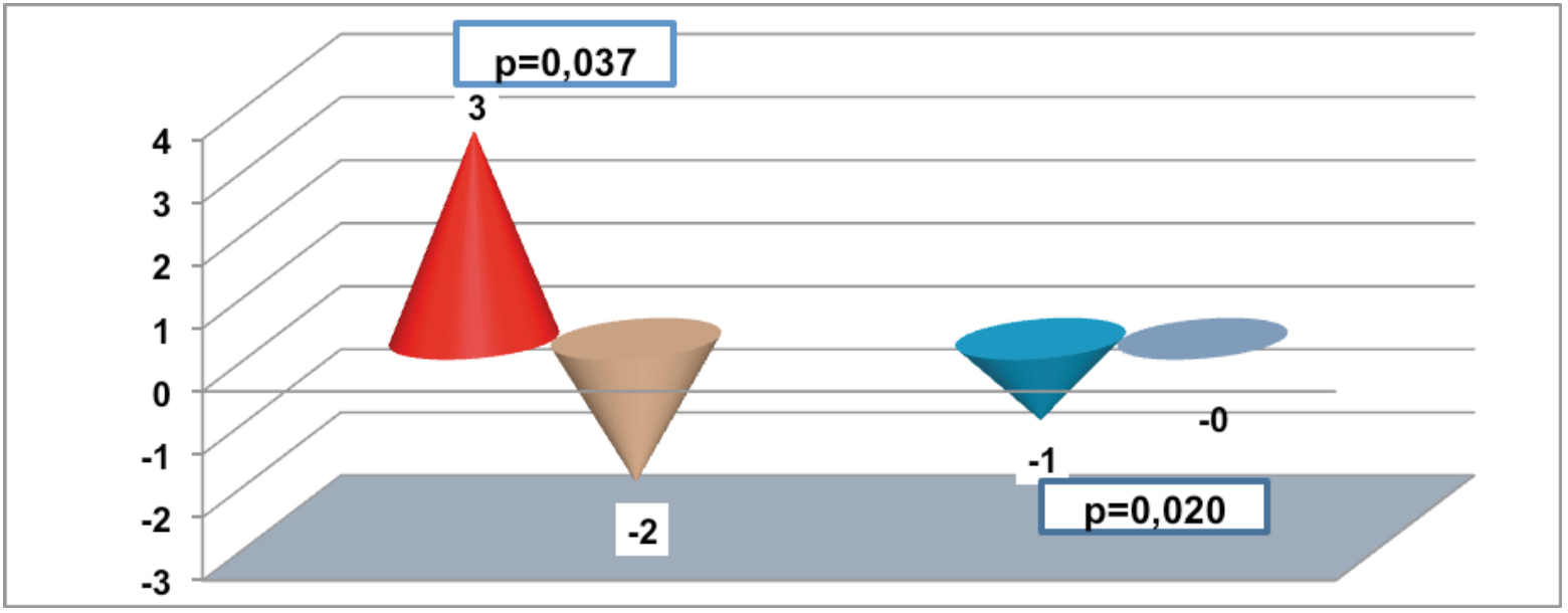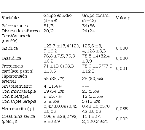 Entre las variables clínicas (tabla 2), (descritas en ambas observaciones), se destaca que frecuencia de las palpitaciones, en el grupo de control superaban las inicialmente constatadas; 34/36 y la disnea de esfuerzo no varió; 24/24. Tales manifestaciones en el otro grupo se redujeron sustancialmente. Los dos grupos exhibían un adecuado control tensional, aunque los controles mostraban valores discretamente elevados con relación estadística altamente significativa para ambos componentes de la tensión arterial, tanto sistólicos; 125,6 ±8,4 y 128 ±8,3 mm Hg (Z= -3,587, p= 0,000) como diastólicos; 78,6 ±4,9 y 82,4 ±3,9 mm Hg, (Z= -5,012, p= 0,000). La frecuencia cardíaca se elevó menos en el grupo de estudio; 71 ±13,6 y 68,3 ±10,6 mientras que en los controles; 78,6 ±15 y 77,5 ±12,3 pulsaciones por minuto (p/min) con diferencias altamente significativas, (Z= -3,368, p= 0,001). La hipertensión arterial estuvo presente en 35 pacientes (89,7%) del grupo de estudio y 38 (90,5%) en los controles. Para el primer grupo, no requerían terapia antihipertensiva 4 pacientes (11,4%). Se controlaban con monoterapia 19 (54,3%) en los mismos y 21 (55%) en los controles, con biterapia 9 (25,7%) vs 12 (31,6%) y con tres fármacos obtenían control: 3 (8,6%) del grupo de estudio y 5 (13,2%) los controles. En relación con los resultados de laboratorio, no se precisa variación sustancial en cuanto a las cifras de hematocrito; 0,43 ±0,06 y 0,45 ±0,06 en el grupo de estudio vs 0,42 ±0,05 y 0,42 ±0,06 l/l el de control, aunque sí revelaba significación estadística, (Z= -2,114, p= 0,035) mientras la creatinina sérica varió en los individuos intervenidos de; 106,8 ±26,18 a 99,8 ±23.9 μ Mol/l y en los controles de; 114 ±27,8 a 120,3 ±31 μ Mol/l con alta significación estadística (Z= -3,077, p= 0,002).