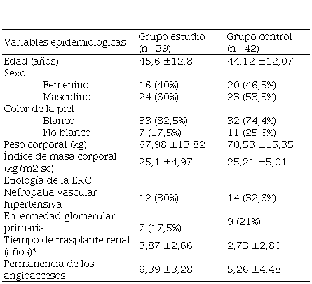 La tabla 1 muestra las variables epidemiológicas estudiadas. La edad tuvo un comportamiento muy similar para ambos grupos: 45,6 ±12,8 y 44,12 ±12,07 años, con mayor frecuencia el sexo masculino y el color de piel blanca. El peso corporal fue menor en el grupo de estudio; 67,98 ±13,82 y 70,53 ±15,35 kg en el de control y mínimamente superior el índice de masa corporal en los controles. La nefropatía vascular hipertensiva y la enfermedad glomerular primaria constituyeron las etiologías originarias de la ERC predominantes para los dos grupos seleccionados. El tiempo de TR superó en el grupo de estudio al de control; 3,87 ±2,66 vs 2,73 ±2,80 años respectivamente y también lo fue, de manera global, para la permanencia de los angioaccesos; 6,39 ±3,28 contra 5,26 ±4,48 años.