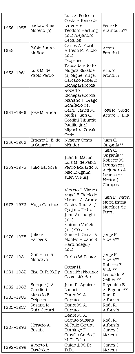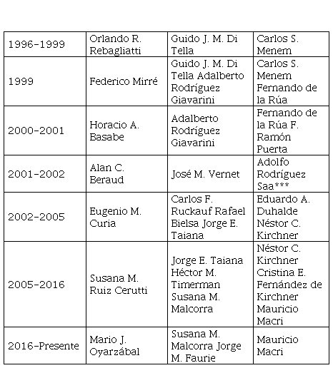 La descripción que hemos realizado evidencia un fortalecimiento del Ministerio de Relaciones Exteriores y Culto con funcionarios que fueron consejeros legales con carácter de miembros o posteriores directores (como el diplomático de carrera Gobbi; Kelly, exconsejero legal y luego vicecanciller de Alfonsín; junto con Delpech, consejero legal entre 1983-1985; y Ruiz Cerutti como continuadora, luego canciller, que deja la Consejería Legal a Basabe),101 en comparación con la administración que culminara en diciembre de 1983, y aparece como un eslabón obligado a cualquier decisión de naturaleza política, económica o jurídica de relevancia internacional, incluso en aquellos asuntos decididos políticamente en la “mesa chica” a partir del dúo Alfonsín-Caputo.102