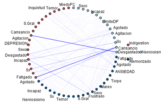 Se generó un modelo de asociación con variables significativas, en el cual todas son consideradas de la misma jerarquía para poder establecer fuerzas de relación existentes entre dos o más variables simbólicas. Cada variable describe una característica presente en el total de la muestra extraídas de los ítems que componen los tres instrumentos aplicados (Figura 2).