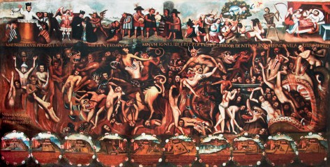 Aquel proceso, además, fue alimentado desde diferentes lenguajes, algunos más accesibles en los Andes que el alfabético. La pintura de lienzos, sobre todo, sirvió para la reproducción de imágenes y escenas, que servirían para reemplazar algunas de las representaciones locales. En Bolivia todavía existen algunas pinturas en paredes de templos y en lienzos que sirvieron para reforzar la pastoral del miedo. “el Cielo” y “el Infierno”, por ejemplo, son dos grandes lienzos con imágenes que recrean lo “bueno” y lo “malo” de la vida. El demonio, como lo malo está representado en “el Infierno” y en este lienzo se muestra con exhaustivo detalle cada una de las acciones de pecadores que se convierten en demonios y los castigos que esperan luego. Todo el trabajo realizado para instalar la idea de pecado, desde el texto escrito, fue iconizado a través del color y la forma, con esto se logró graficar los símbolos que representaban el proceso de demonización en las mentes.