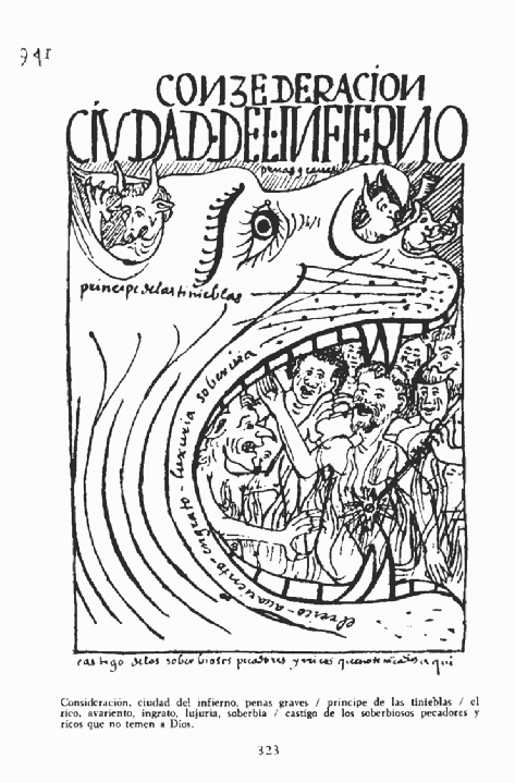 En un corto tiempo aquellos procesos y prácticas rituales, además de perder jerarquía en relación a las prácticas cristianas, se convirtieron en idolatrías y fueron consideradas pecaminosas. Un ejemplo de este proceso, que tiene a la Pintura Virreynal como su mejor herramienta (ver fig. 1), está contenido en la subjetividad del cronista Huamán Poma de Ayala quien ya tenía internalizados aquellos dispositivos cuando dibujó a los pecadores y a la ciudad del infierno en su crónica (ver fig. 2). Ésta ha sido la forma en la que se ha producido uno de varios epistemicidios 15, que sirvieron para consolidar luego una geopolítica de conocimiento dominadora.